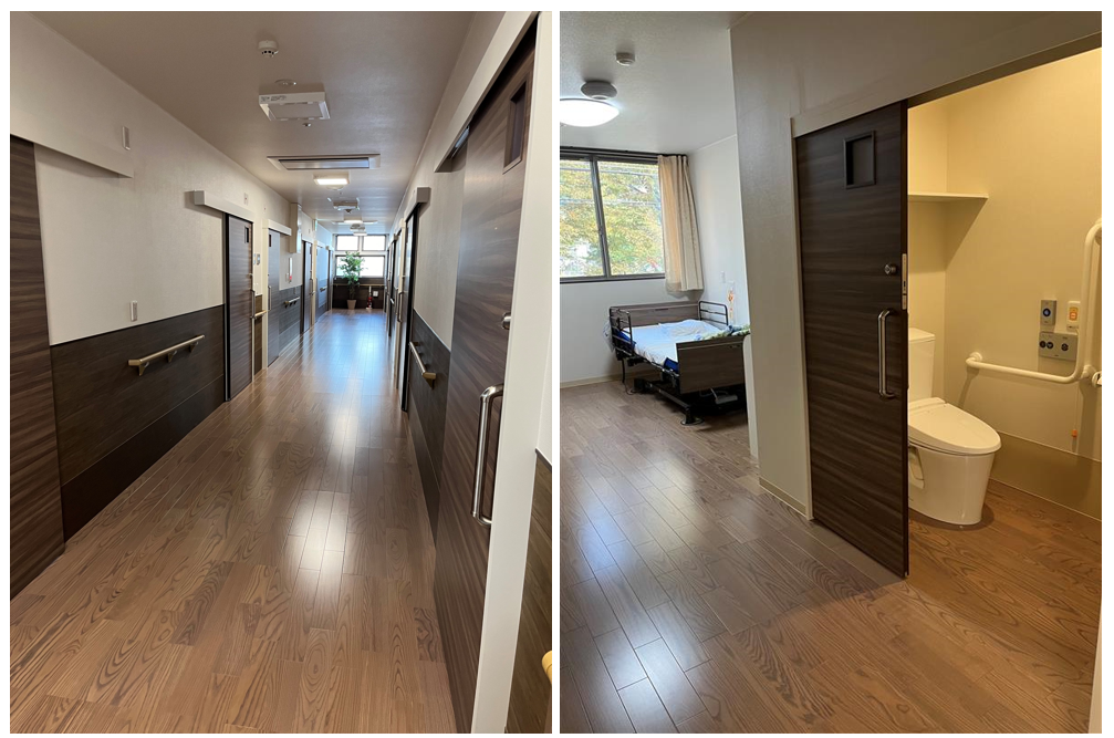 👆入居フロアの廊下(写真左)と個室(写真右)。実際に行くと、日当たりの良さも分かります🌞