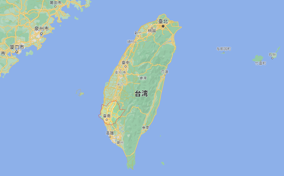 👆台湾の南部、赤枠に囲まれたエリアが台南市です。 ©️Google