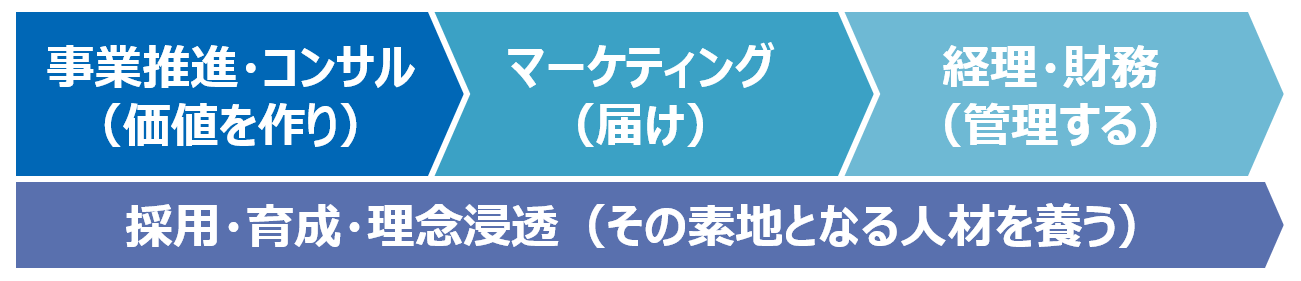 私たちメディクルードは、経営は「価値を作り」、「届け」、「管理する」こと、そのための「人材を育てる」ことから成り立っていると考えています。それらの経営の基礎を、NLPの2年間で「採用」「事業推進」「マーケティング」「財務経理」のジョブローテーションを通じて学びます。