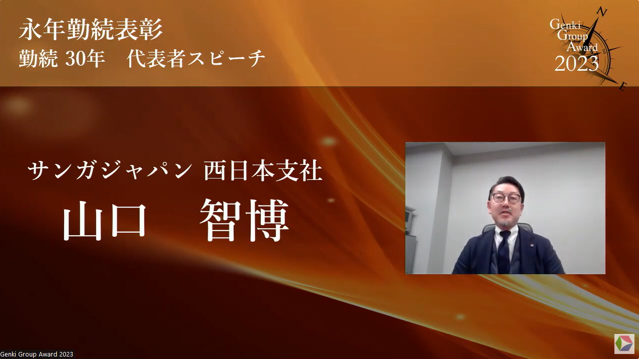 永年勤続表彰は、長きにわたりグループに貢献してくださった皆さんを称える賞です。表彰者には、神成社長からの感謝の言葉が贈られます。その後、表彰された代表者の方から、今までの気持ちやこれからに向けてのお話をいただきました。今回は勤続30年で表彰された、株式会社サンガジャパン 山口西日本支社長のスピーチを抜粋して紹介します。