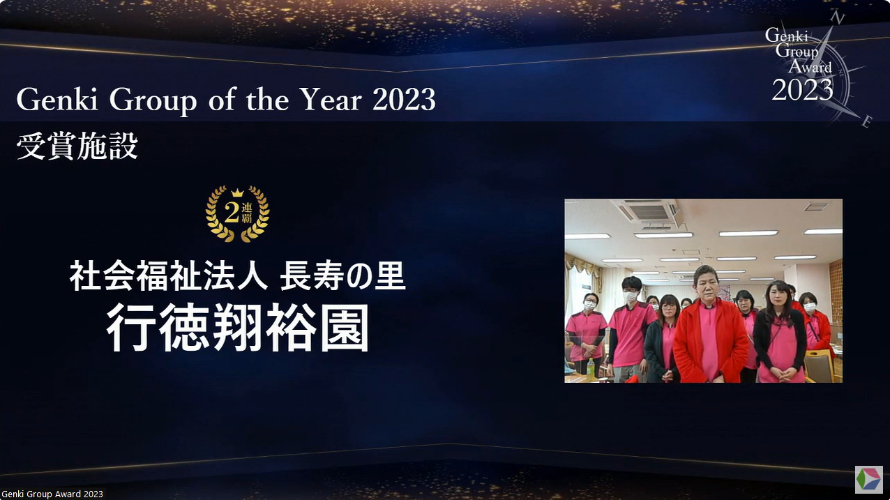 さらに、学校や地域との交流・地域への貢献のあり方は今期も健在であり、幸せのプラットホームとして他の施設の模範となる取り組みも多いことを評価し、ここに栄誉あるGenki Group of the year 2023の賞を贈ります。