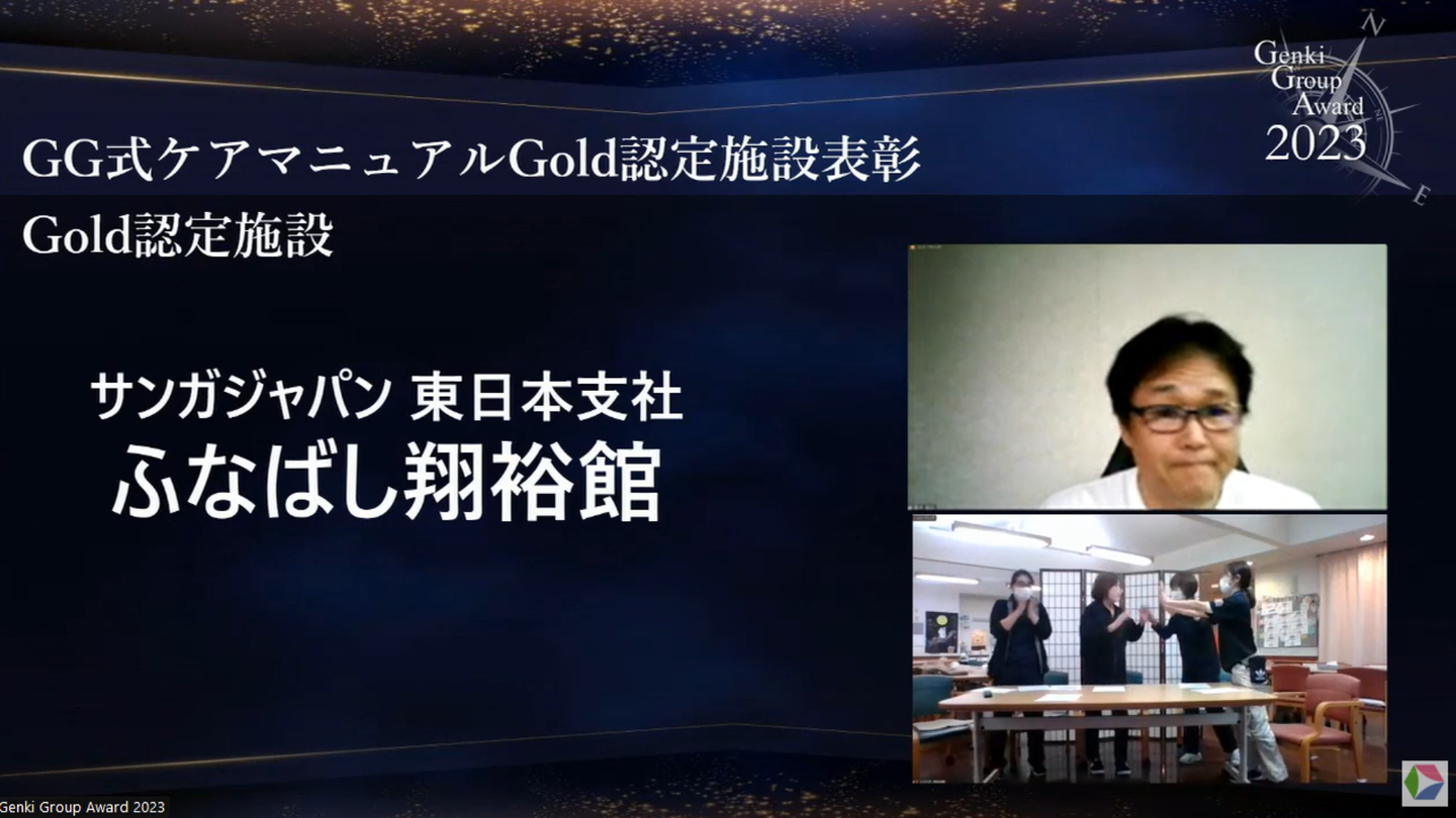 最初の表彰項目は『Genki Group式(以下GG式)ケアマニュアル』表彰です。Genki Group式の介護の技術とその実践方法が記されている独自のケアマニュアル全8種の中で、今回は『GG式認知症ケアプログラム』『GG式ノーリフティングケアプログラム』『GG式口腔ケアプログラム』にて高い実践度合いが認められた施設が表彰されました。こうした表彰を通して、浸透施策の仕方やより良いケアをGenki Group全体へ波及させています。