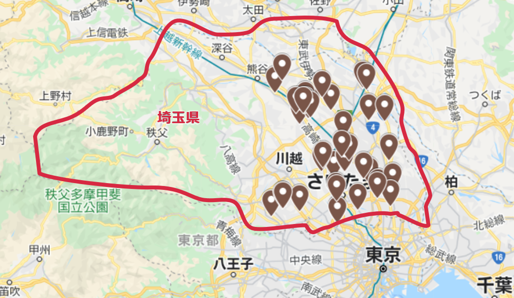 埼玉県にはご覧の通り非常にたくさんの拠点がありますが、特に鴻巣市には様々な施設が密集しています。介護施設はもちろんのこと、病院、歯科クリニック、就労支援施設、学校、ラジオ局などが車で数分で行けてしまう範囲に集まり、互いにシナジーを生み出しながら街全体で「より良い」生活を実現しています。また大宮周辺も同様に、介護施設、整形外科・内科のクリニック、歯科クリニック、美容クリニック、学校など様々な拠点があり、見どころ満載です。