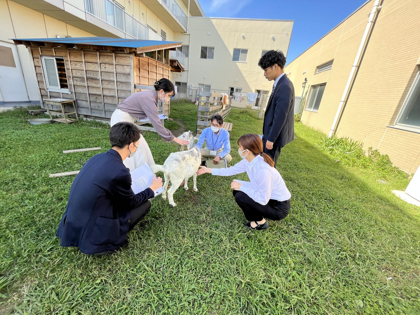 ☝内定式の一環で訪れたこうのすタンポポ翔裕園にて、ご利用者にも地域の方々にも子どもたちにも大人気のヤギ(メイちゃん)と戯れている様子。