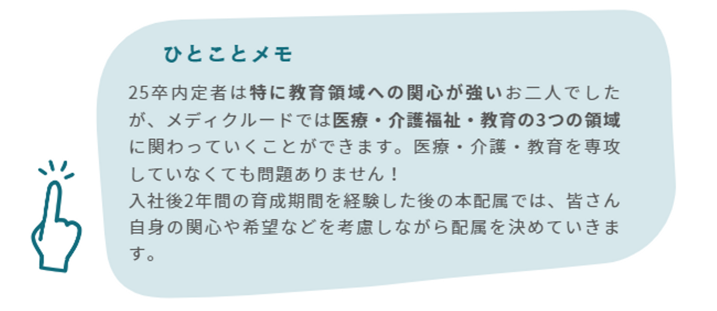 Nさん)あとは、教育以外の医療や介護領域への興味・関心も聞かれました。それぞれの領域でも取り組みたいことがある、ということを素直にお伝えしました。それぞれの領域で課題がたくさんあることは、メディクルードのインターンシップなどを通してよく理解していたので、そのなかで自然と問題意識が芽生えていたのだと思います。教育だけじゃなくてGenki Group内の様々な領域に関われることがメディクルードの魅力ですもんね。