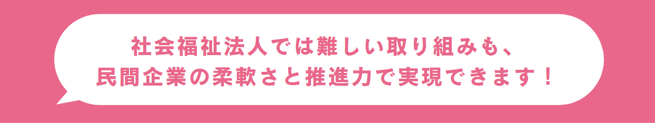 社会福祉法人では難しい取り組みも、民間企業ならではの柔軟さと推進力で実現しています。