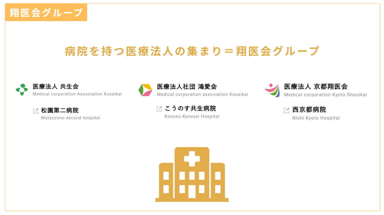翔医会グループは、Genki Groupに所属する共生会・鴻愛会・京都翔医会の3つの医療法人が連携し、より良い医療を提供するために2024年に新たに発足したグループです。