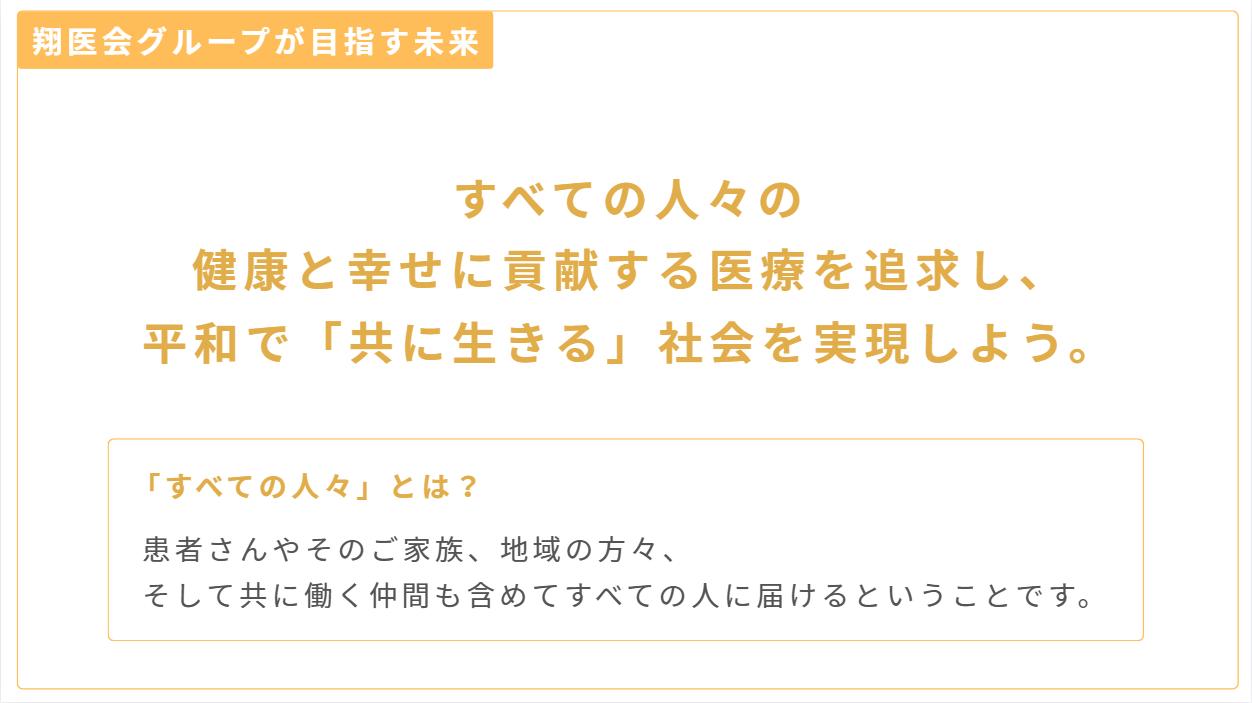 翔医会グループは、「共に生きる医療」を実現し、すべての人が健康と幸せを実感できる社会をつくることを目的に設立されました。