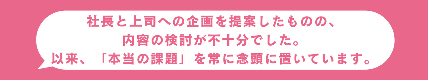当時の私は、手段にとらわれすぎて課題を深掘りしきれていませんでした。課題を根本から捉え、ゴールを丁寧に描くことの大切さに気づいた経験でした。現在は、例えば業務の依頼を受ける際には、必ずその目的と課題を質問するようにしています。手段にとらわれるのではなく、依頼者の方にとっての「本当の課題」を明らかにすることを大事にしています。