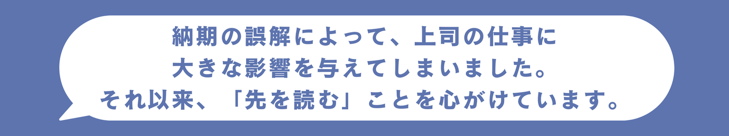 以降は、タスクごとに相手の立場に立ったスケジュール調整や、進捗報告を細かく行なうようにしています。失敗は辛かったですし今でも完璧にはできていませんが、あの経験がなければ今のように「先を読む」意識は持てなかったと思います。
