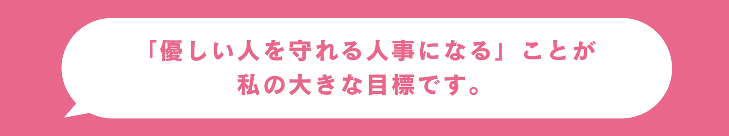 学生時代からずっと、「優しい人を守れる人事になりたい」という想いを持ち続けてきました。1年働いた今でも、その気持ちはまったく揺らいでいません。