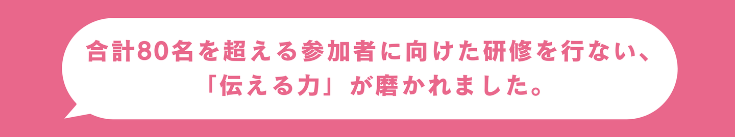 研修では参加者のモチベーション維持が難しいのですが、参加者一人ひとりに対して前向きに語りかけることを心がけています。最初は研修に後ろ向きだった参加者が、最後にはポジティブな発言が増えて積極的に参加してくれていた時には、講師としての成長を感じました。また、講師としての話し方や間の取り方なども、実践経験を重ねることでかなり上達しましたし、同時に弱点も見つけることができました。