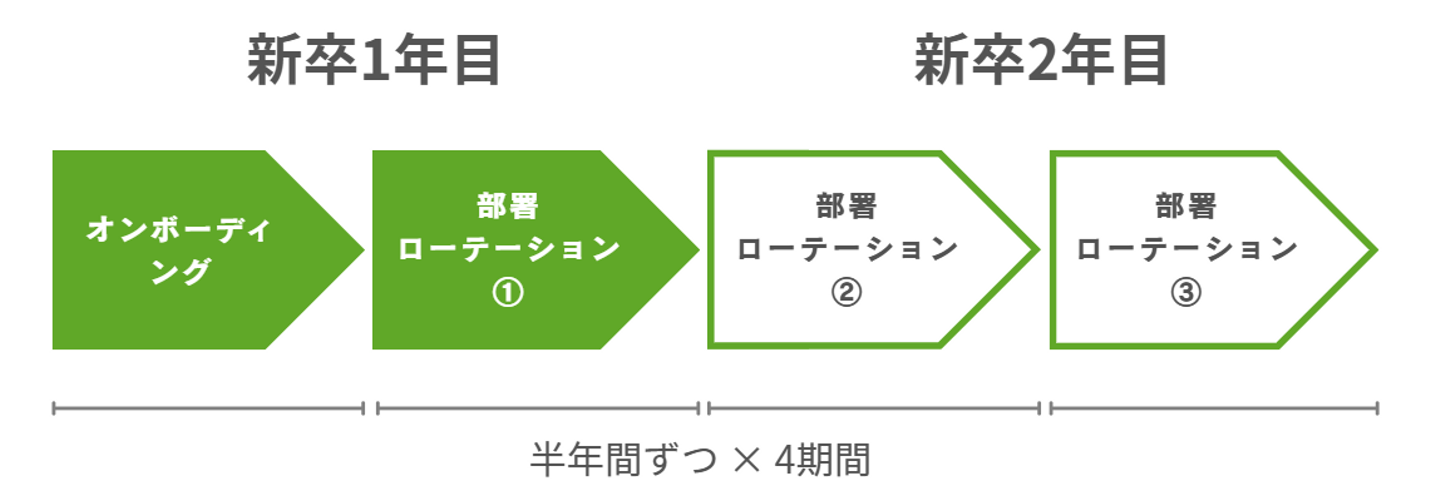 メディクルードに新卒入社した後は、半年間のオンボーディングを経験し、部署ローテーションを経験します。部署ローテーションでは3部署を半年間ずつ、合わせて1年半経験していただきます。なので、1年目ではローテーション第1弾を半年間経験します。詳しくはこちらの記事をご覧ください!