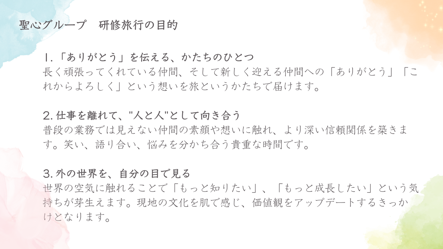 研修旅行は、単なる「福利厚生のイベント」ではありません。聖心グループの研修旅行には3つの意図・目的があります。