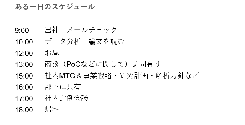 ーではスタートアップで働いてみたいと思っている研究者の方がより働き方をイメージできるよう、MEDITAでの研究者としての働き方のとある一日のスケジュールを教えていただいてよろしいでしょうか?