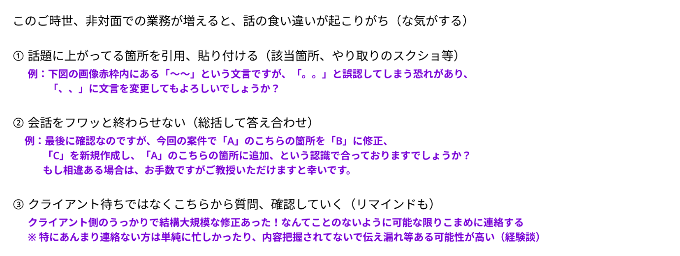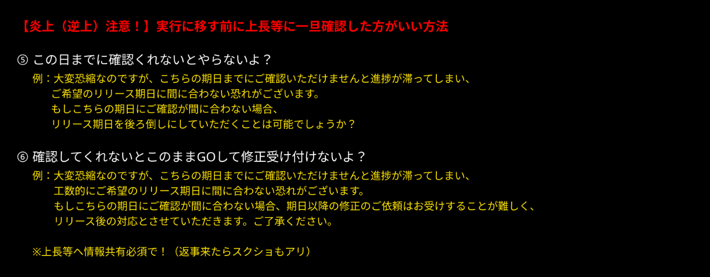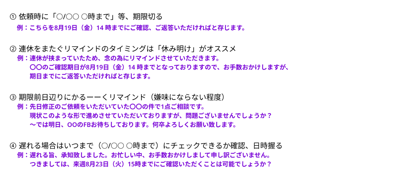 それぞれ確認を送る時、リマインドをする時、FBが遅れる時にただそれを受けるだけではなく、あらかじめ期限を設けて困る状況に陥らないよう先手を打つことが大切ですね!