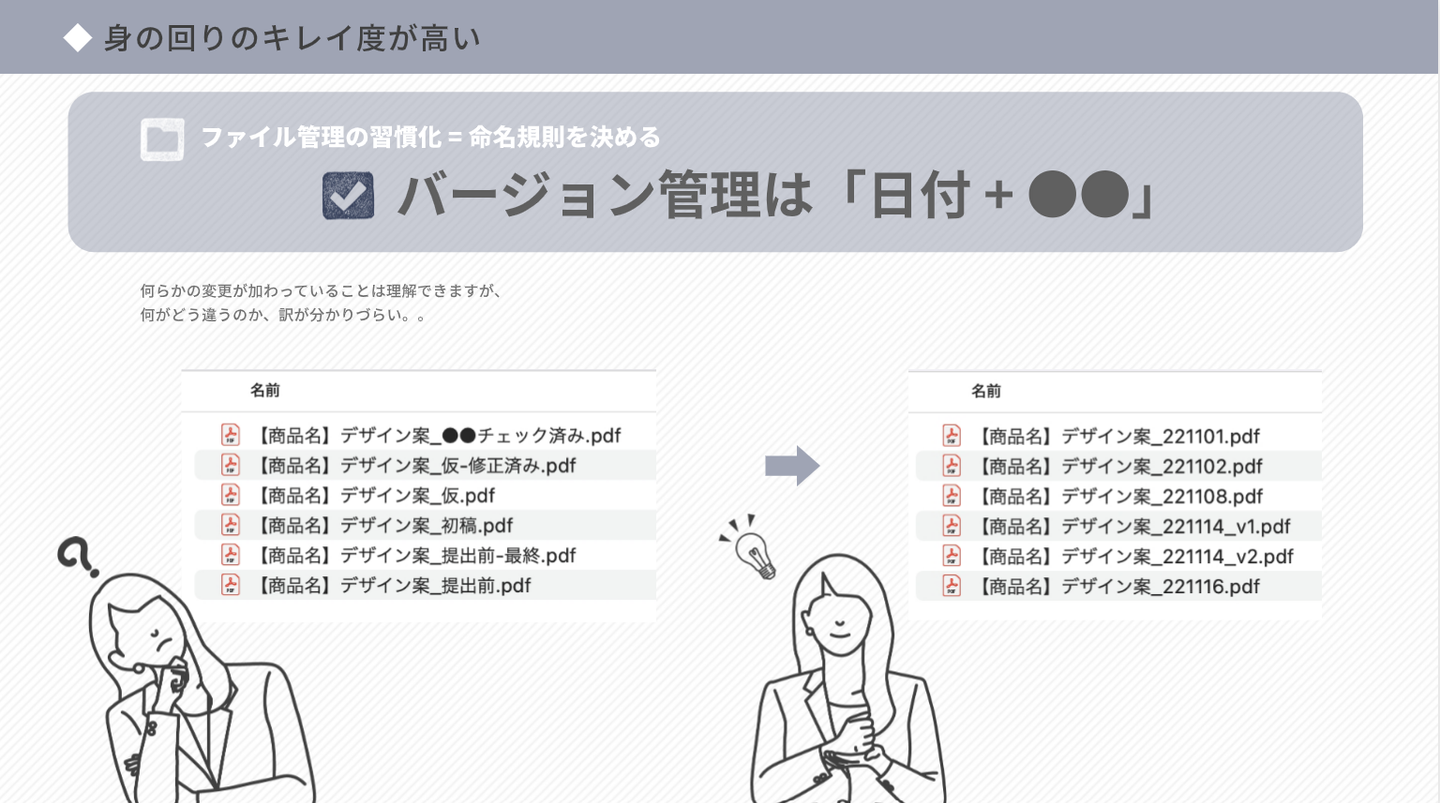 ファイル名を見直すことで時間も節約でき、受け取る側の印象も大きく変わるそうです!