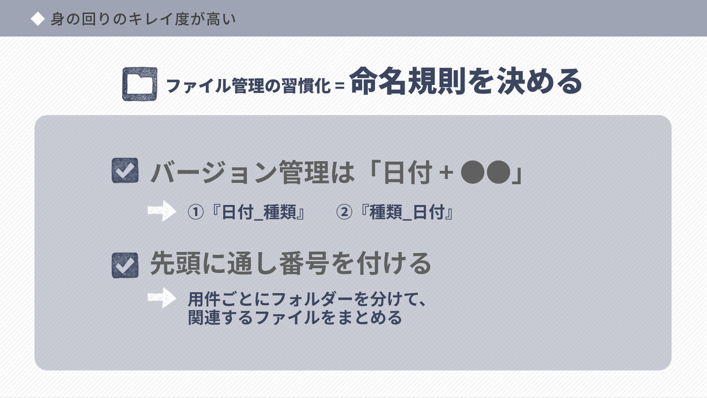 ファイル管理を習慣化するためには、命名規則を決める。つまり自分のルールを決めることが大切だそうです。