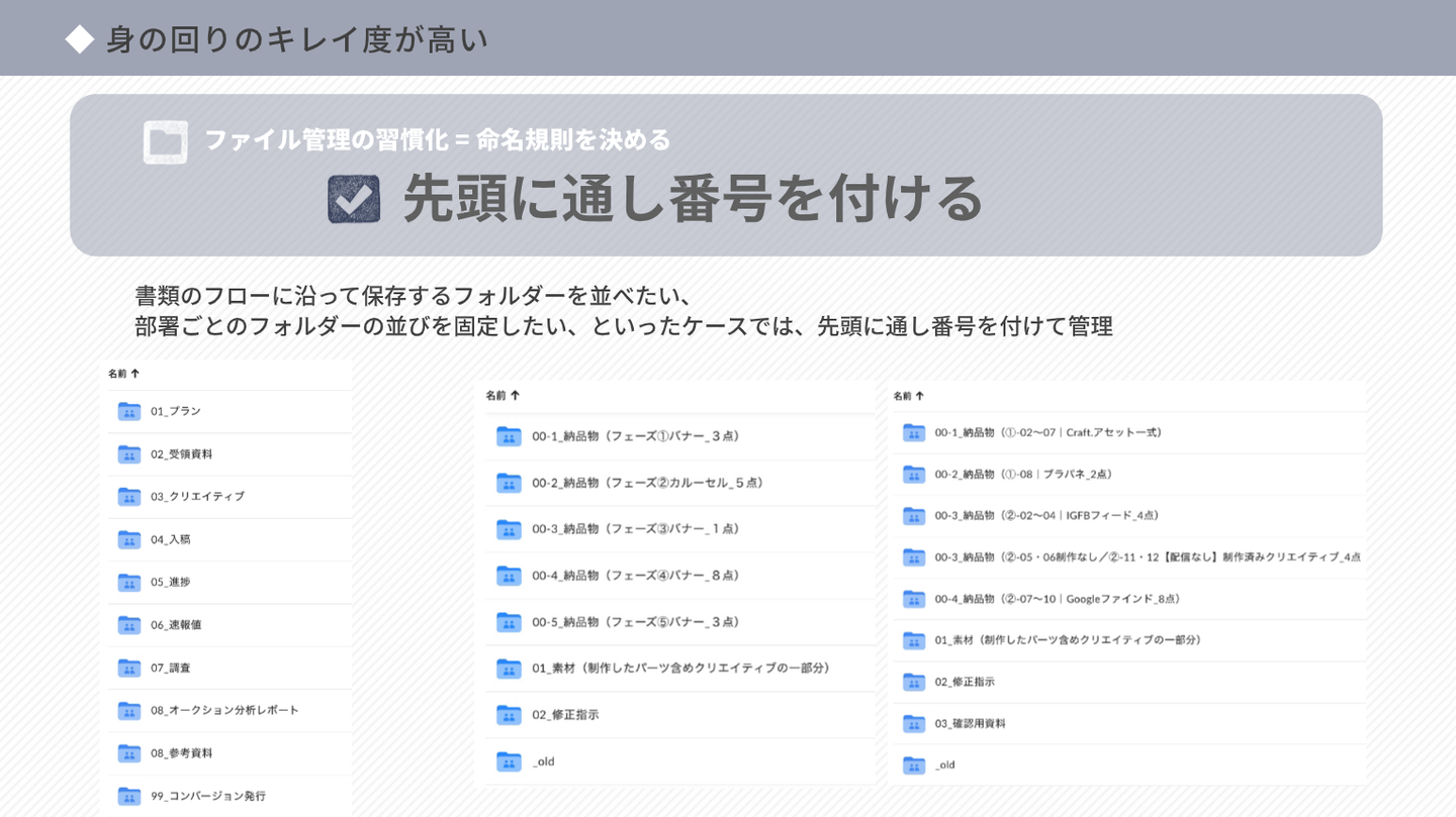 この二つの方法を使い分けることで、フォルダ管理だけでなくフォルダ内のファイルも綺麗に並んでくれます。ファイル名のつけ方を工夫するだけで、その後のファイルの管理がとても楽になるんですね!