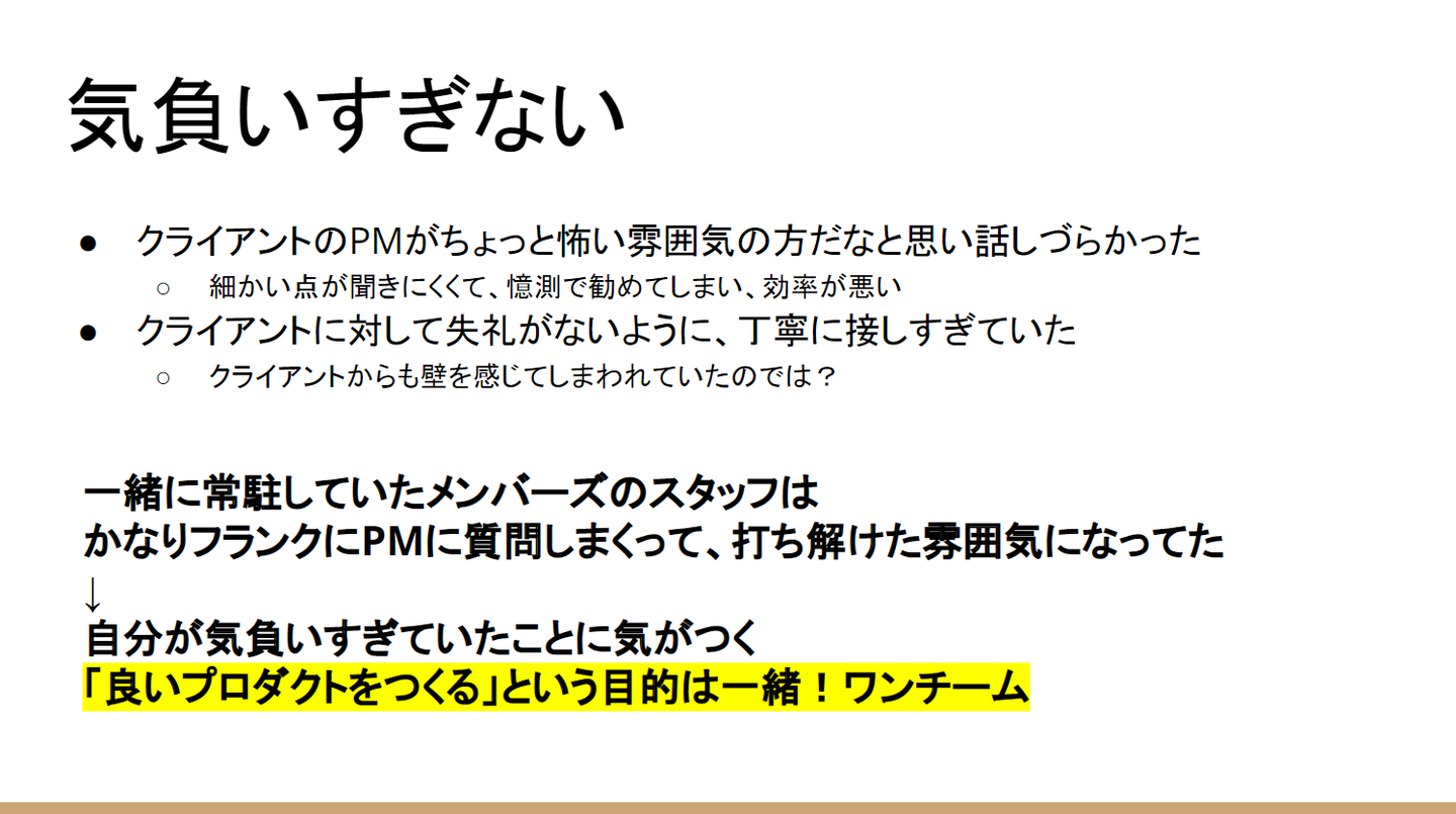 常駐先での経験を元に、クライアント様とのコミュニケーションで困ったときにどう対応していくと良いかを教えてくださいました。
