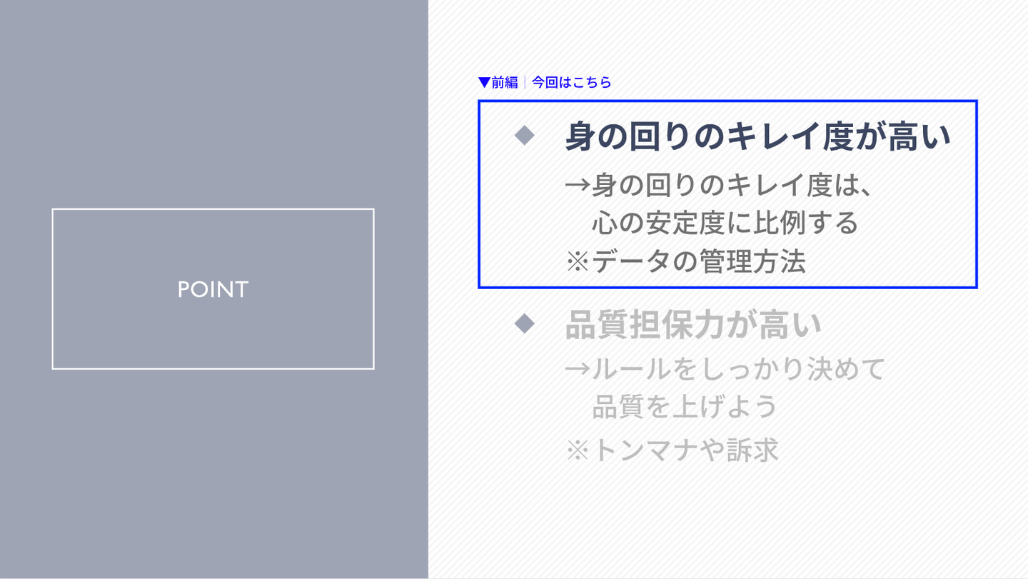 前編では、常駐した時に信頼されやすいポイントの一つ、「身の回りのキレイ度が高い」についてご紹介いただいています。