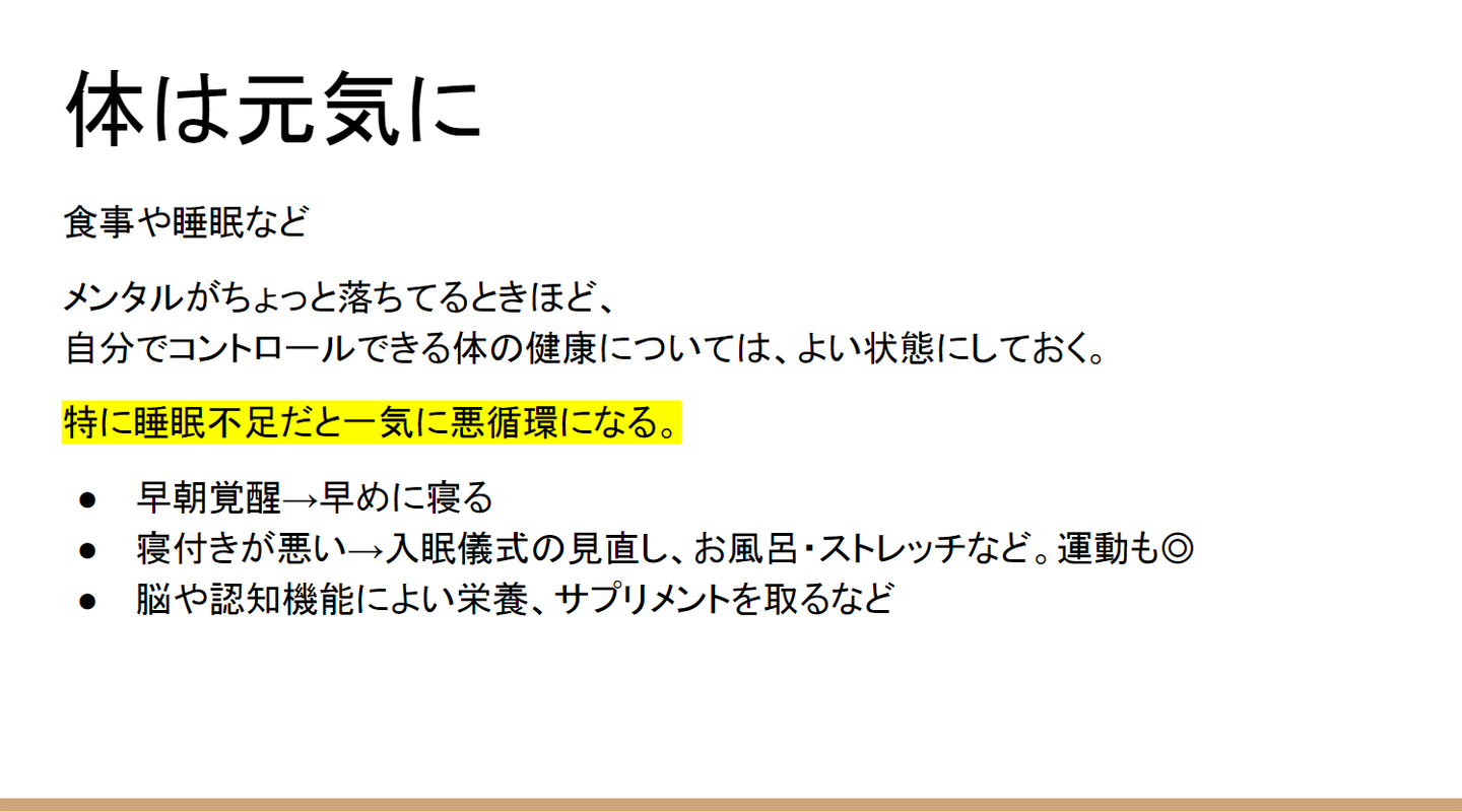 メンタルが落ちている時ほど、体の健康は意識的によい状態にしておくことが重要です。