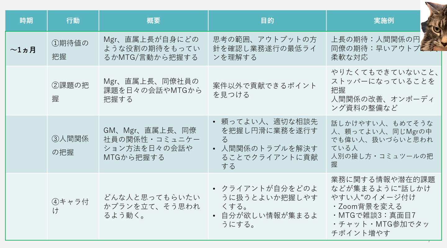 スキルが足り無い分、それ以外の部分でどのようにカバーをしていったのか最初の1ヵ月目~今にいたるまでを時系列にしてくださいました。