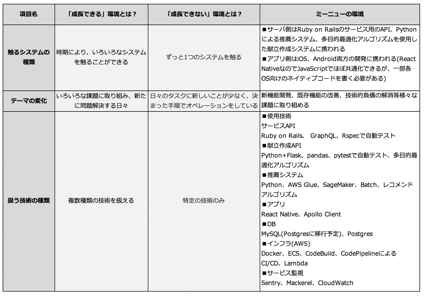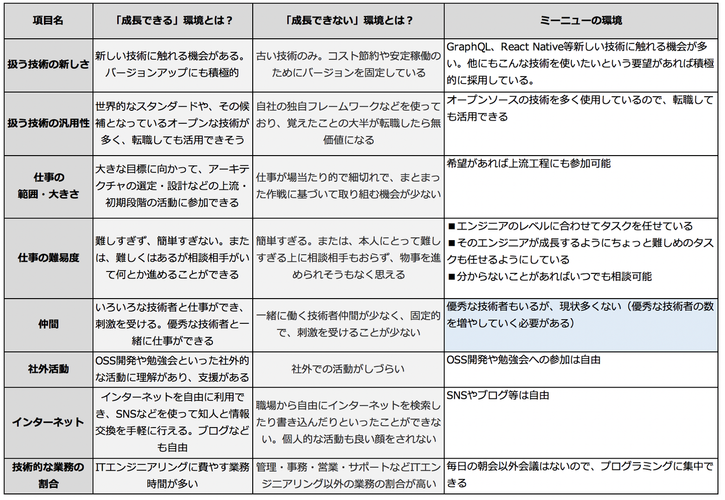とあり、記事中(3ページ目)に、ITエンジニアが「成長できる」環境と「成長できない」環境かをチェックできる一覧表を用意いただいていたので、弊社はどうなのか?チェックして、足りないところは改善していこうと考えたのです。