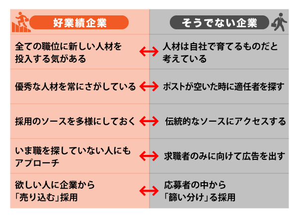 「採用学」で著名な服部先生の寄稿連載でも取り上げられていた本(調査)です。下記の図表を用いて、わかりやすく、本質的な内容が凝縮されています。採用にかぎらず育成・組織の話も多くありますが、あえて「採用」のテーマに。