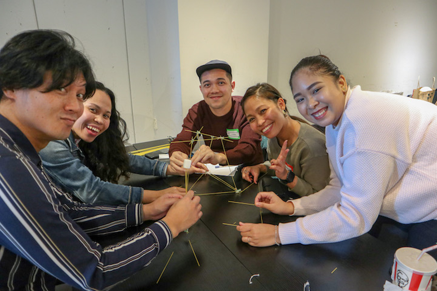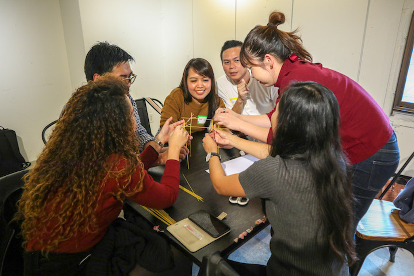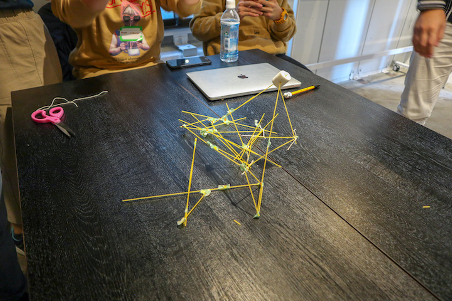 マシュマロ・チャレンジは乾麺のパスタ、テープ、ひもを使って自立可能なタワーを立て、頂点にマシュマロを置き、最も高いタワーを作ったチームの優勝となるゲームです。