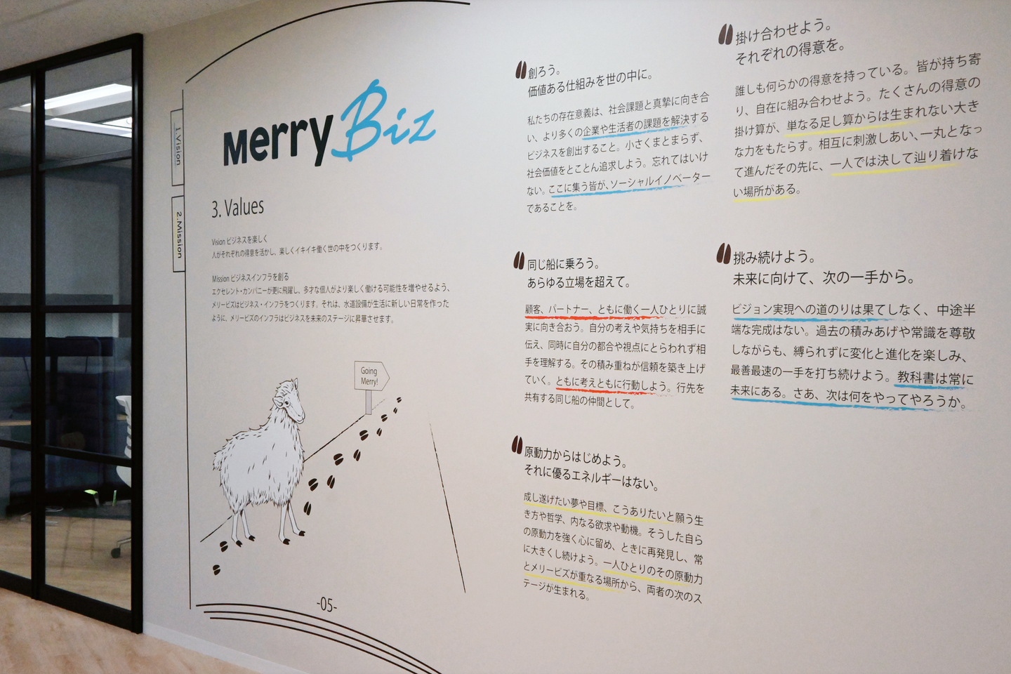 会社として価値観を持って、芯をぶらさないことです。メリービズでいうと、「ビジネスを楽しく」というビジョンをはじめ、ミッション・Value(行動指針)などですかね。会社の価値観って良い悪いはなく、どんなものでもいいと思っています。ただ、中長期的に会社が実現したいミッションを達成するためには、芯がぶれないことが大切です。