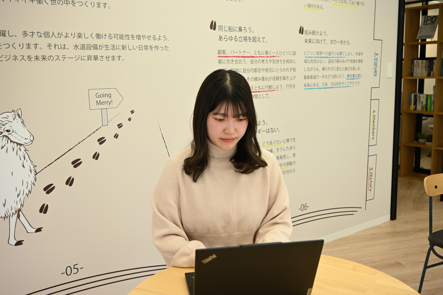 メリービズには5つのバリューがあるのですが、メンバーそれぞれのスタンスや業務の進め方に自然と活かされていると感じる場面が多くあります。前職までは日常的にバリューを意識する雰囲気の会社に属していなかったため、いい意味で驚きでした。