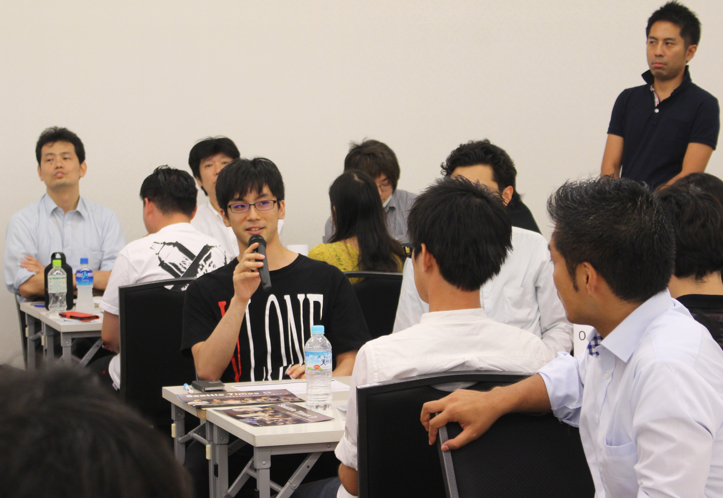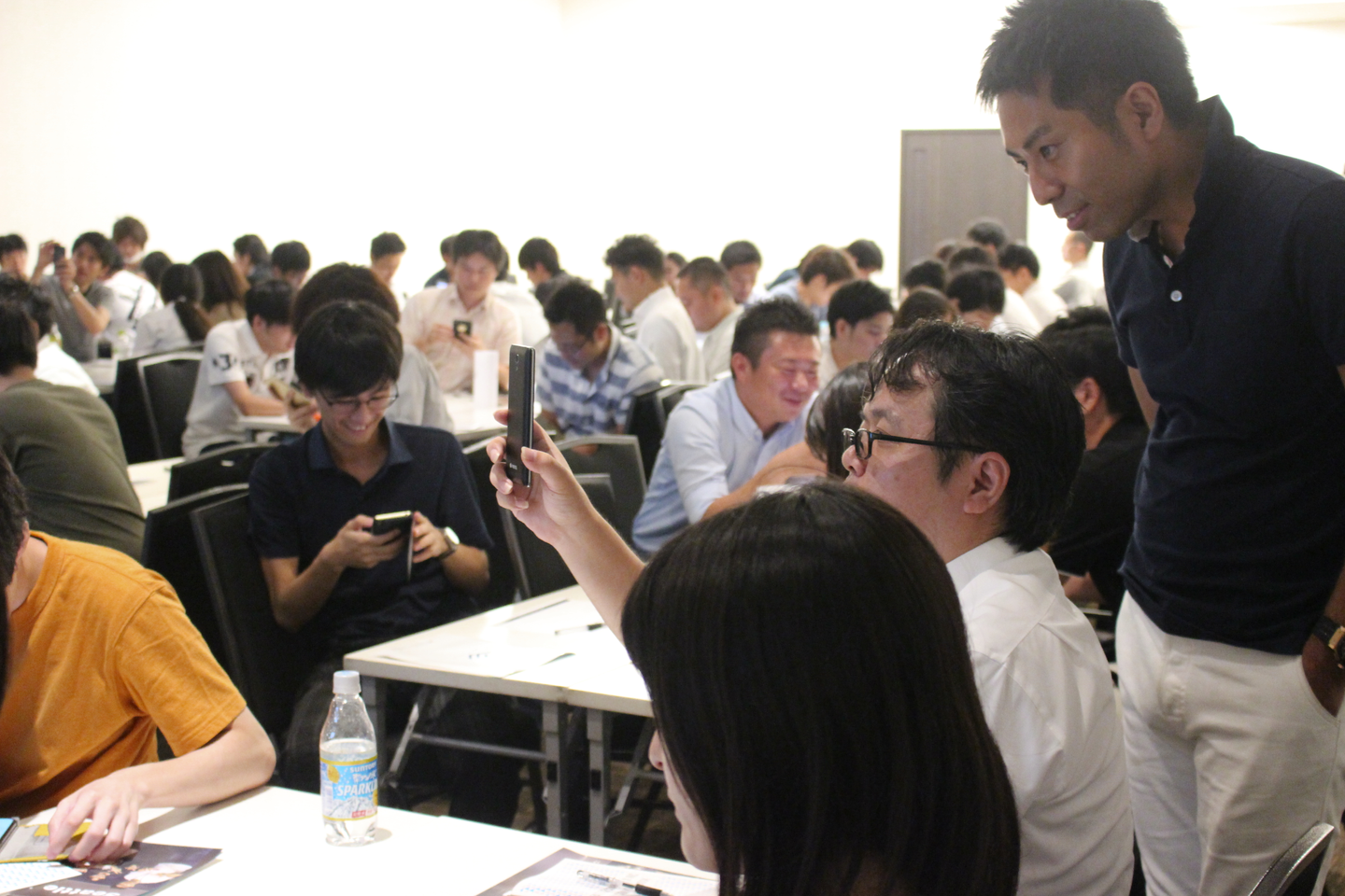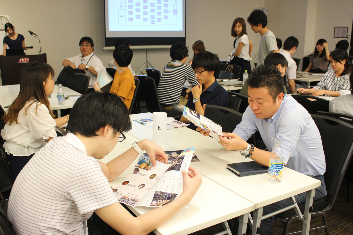▲受付で座席確認中。(今回は座席を所属チームなどを無視して、シャッフルして構成しました。)