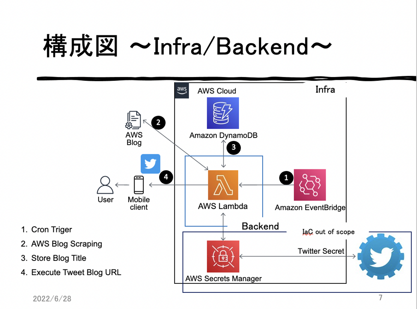 Infra/Backendは、AWS Lambraで管理していて、