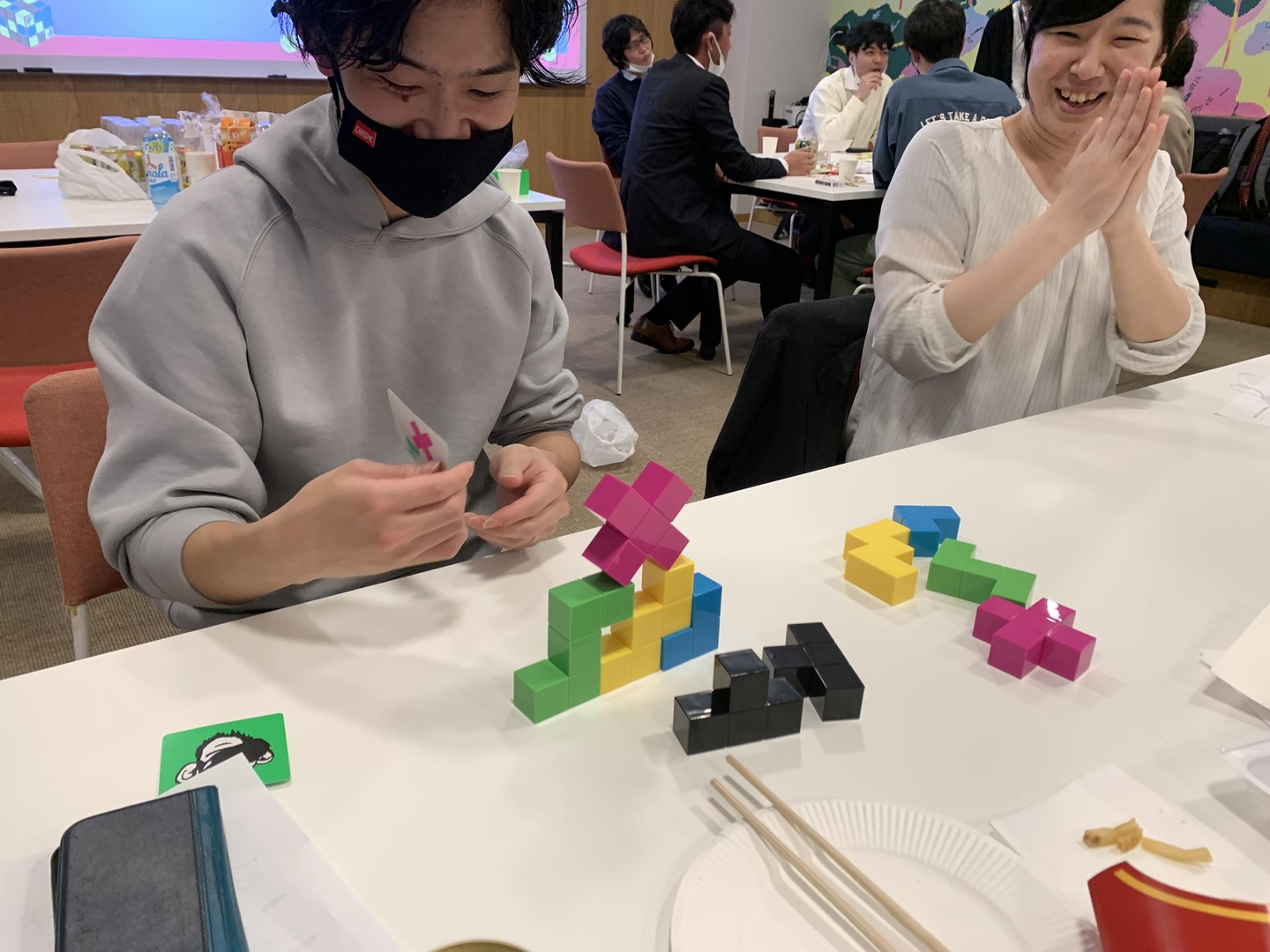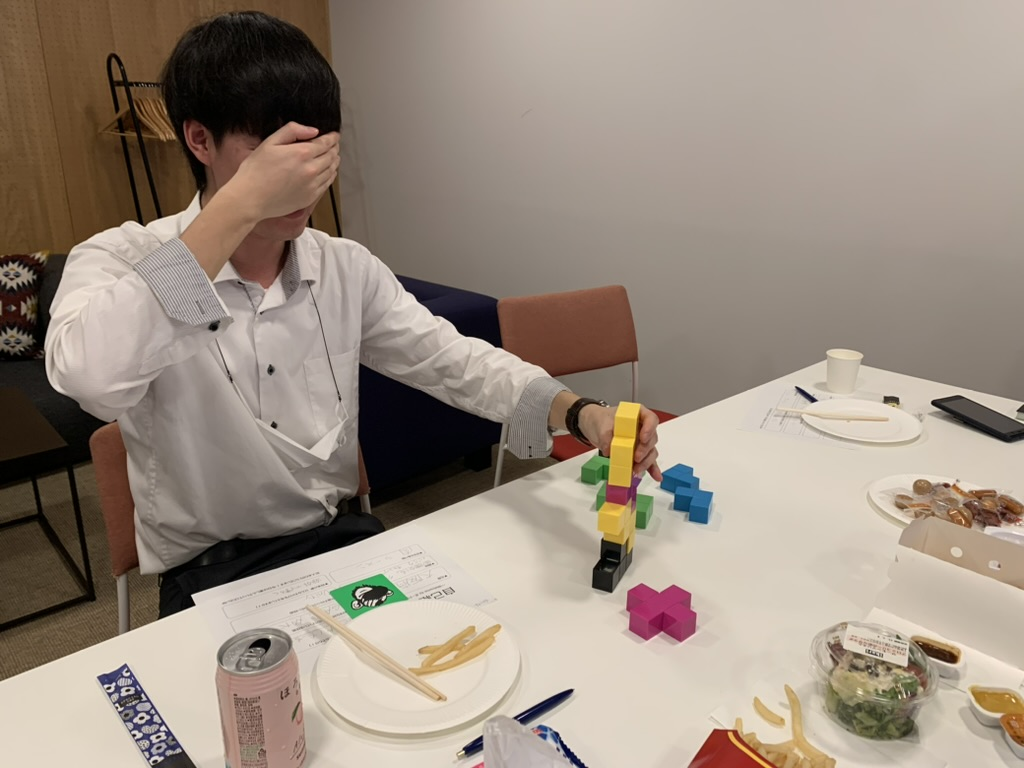 ※目隠しながら、聞かざる担当からの指示をもとにブロックを組み立てる見ざる担当の様子🙈