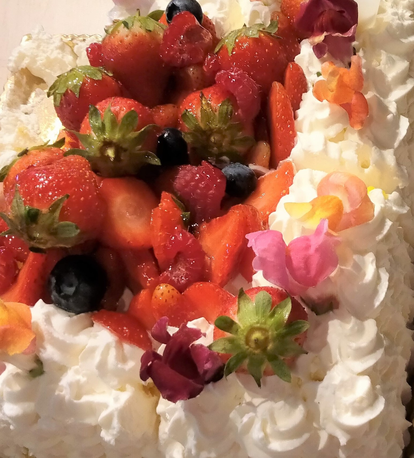 苺とカラフルな食用花がたくさん乗っていて、生クリームのデコレーションが素敵なケーキ🍰