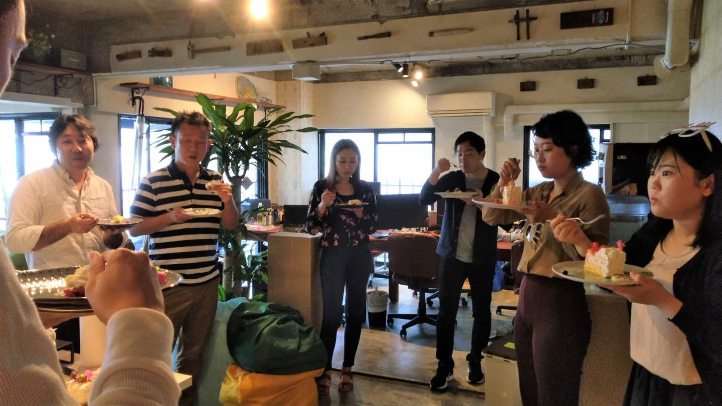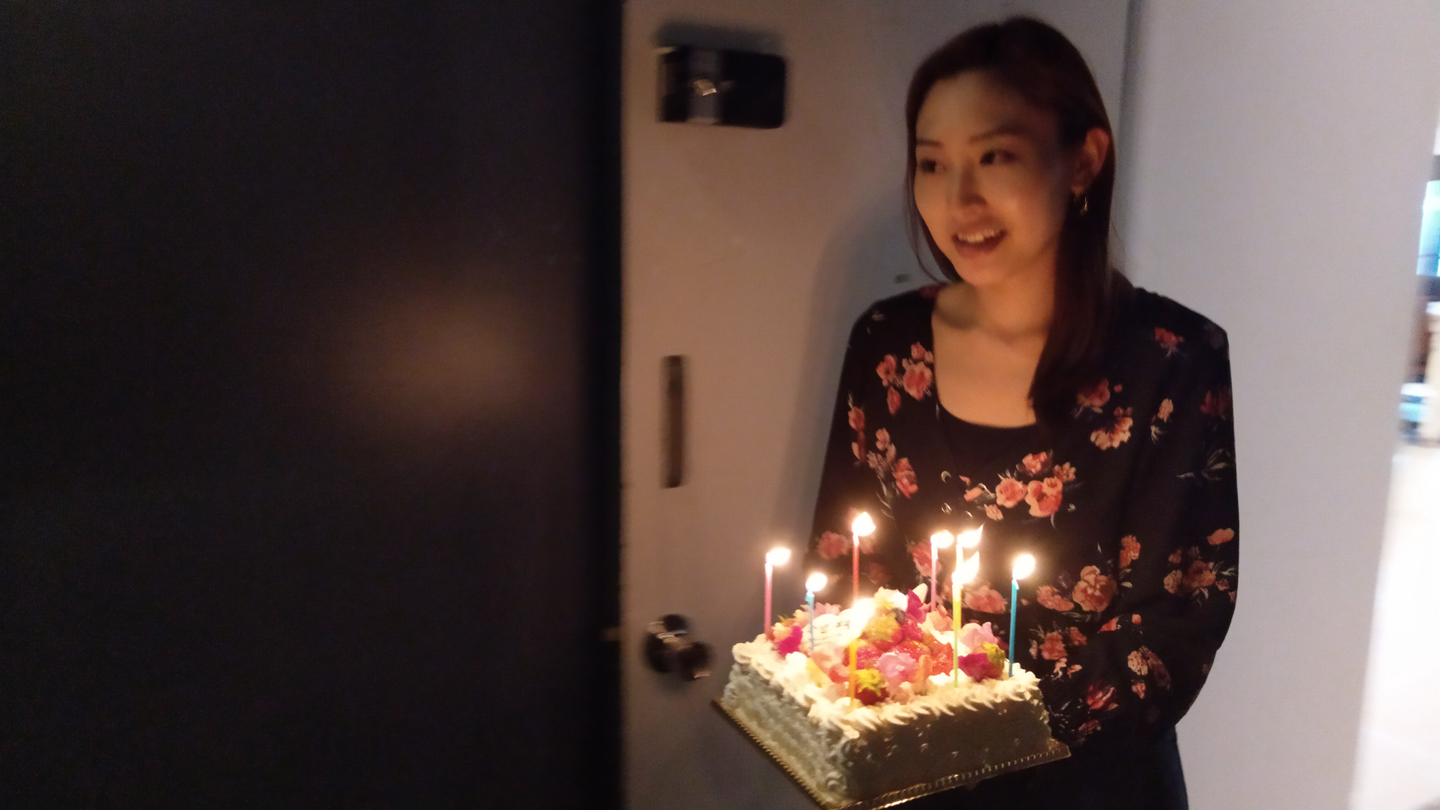 今回は、オフィスの明かりを消して、バースデーソングが流れるとともにケーキが出てくる