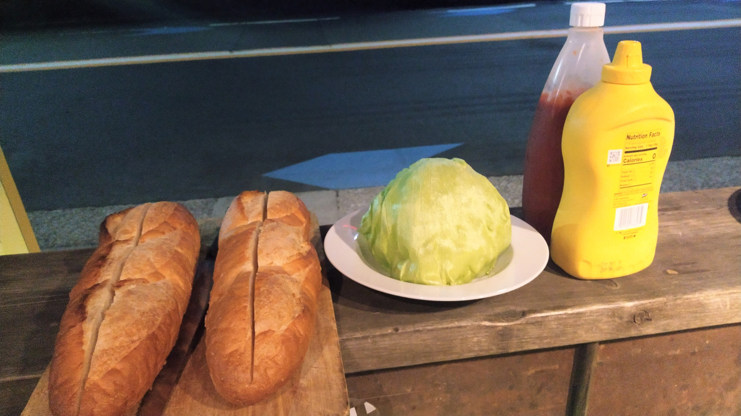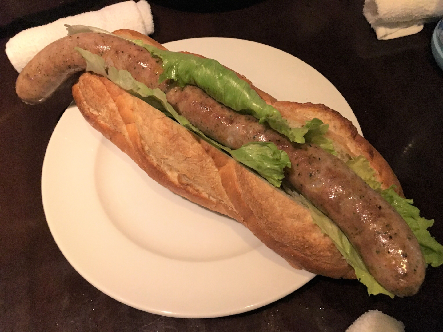 フランスパン1本分に相当する大きさのソーセージを焼いてから、レタスと一緒にパンに挟んで食べるそうです。