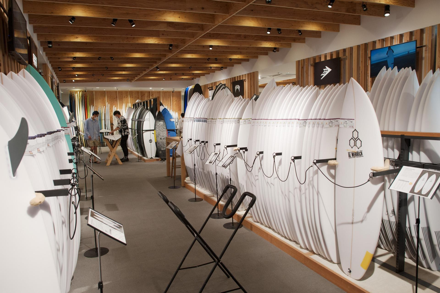 店のワンフロアいっぱいに、ずらりと並ぶサーフボードは圧巻。スケートボード用品も多数取り揃えられており、近隣の湘南ビーチやスケートボードパークも徒歩圏内で、横乗りスポーツ好きにはたまらないお店です。
