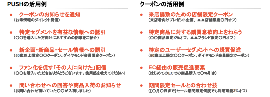 具体施策の一例として、「プッシュ通知」「クーポン施策」などがあげられます。
