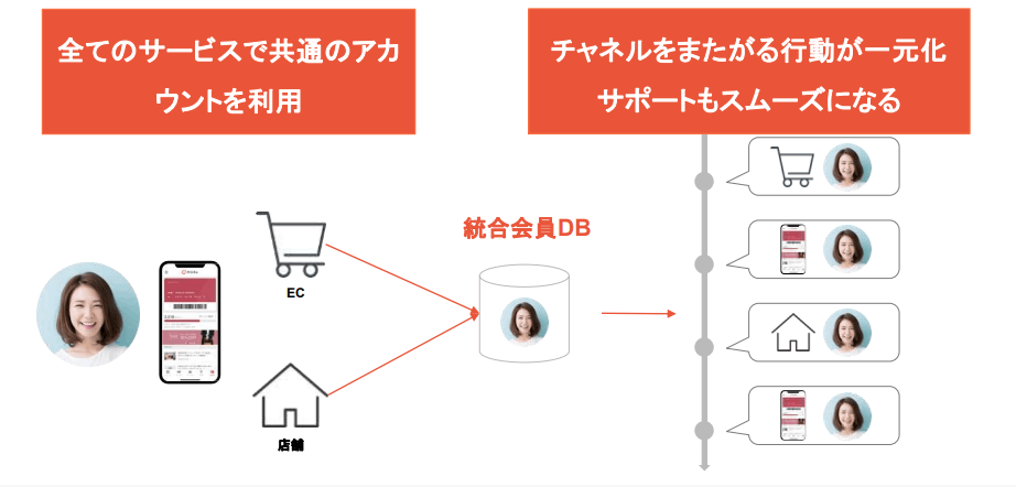 全てのサービスで共通の顧客IDを使用し会員統合をすることで、チャネルをまたいだ行動が管理可能となり、顧客ごとに最適なアプローチを実現できるのです。