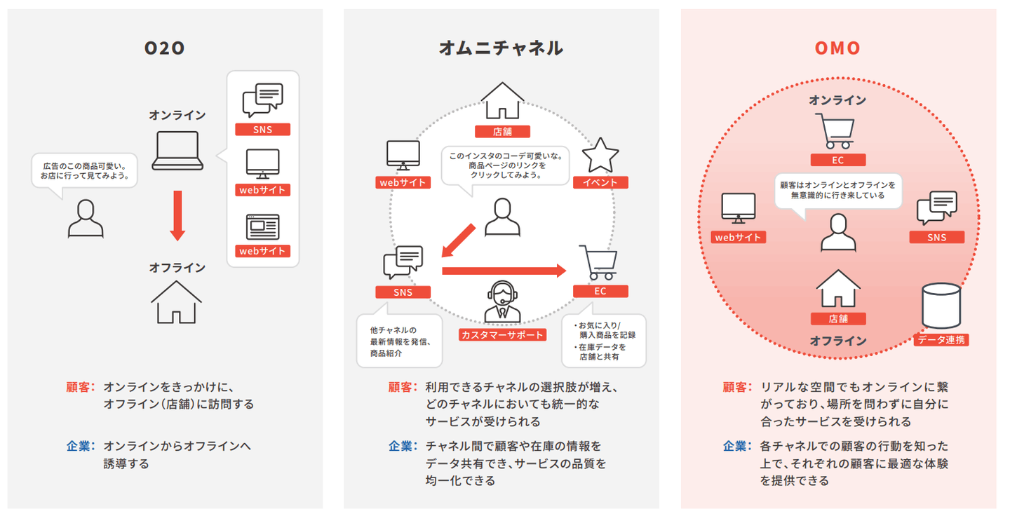 OMOを理解する上では、O2Oとオムニチャネルと比較すると分かりやすいため、以下の図をご参考ください。(※)