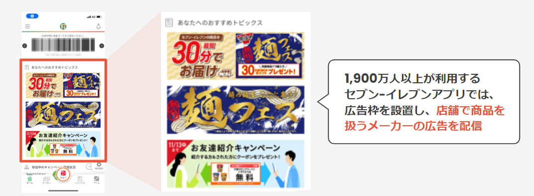 セブン-イレブンは、2022年3月より、自社アプリ「セブン‐イレブンアプリ」上で、セブン-イレブンで商品を扱うメーカーの広告配信を実験的に開始しました。