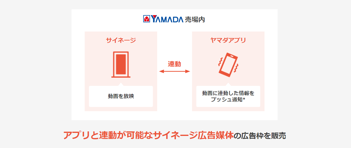 上図からも分かる通り、プラットフォームおよびカスタマージャーニーとしては、綺麗に流れができています。普段からヤマダデンキのアプリをご利用されているお客様に対して、来店していただくために様々なコミュニケーションをとられています。その中のひとつが、広告ですね。さらに、店頭では入店を促進をするためにサイネージが設置されており、店内ではアプリへプッシュ通知などを飛ばすことができます。