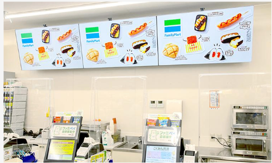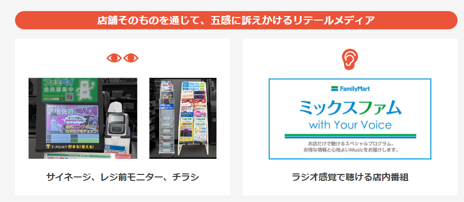 ファミリーマートさんの事例で特に特徴的なのが、デジタルサイネージ・レジ前のモニター・チラシなどを活用し、店舗そのものをメディア化しているという点です。