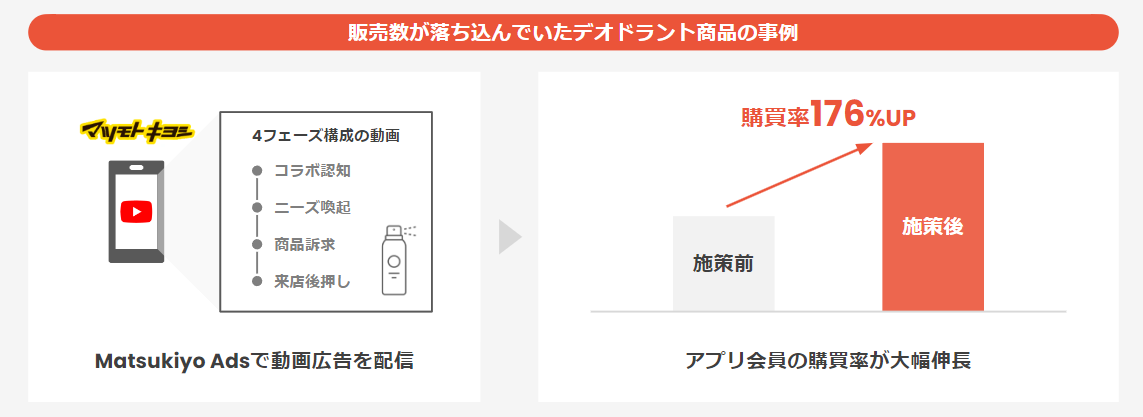 では、具体的に成果がどうだったのか、という点を紹介します。認知から最終的な商品の購買までを、マツモトキヨシさんが設計された方法で広告配信をした結果、購買率が176%に伸びました。