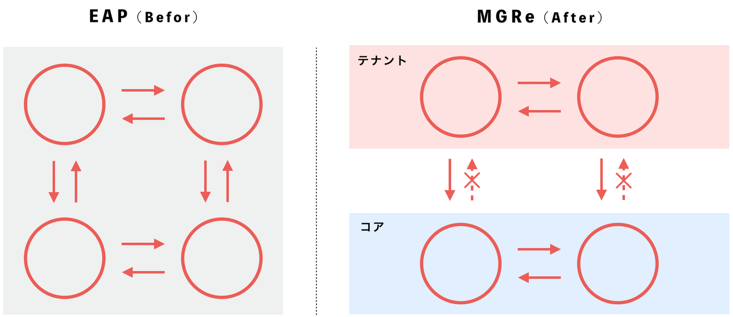 MGReの柔軟性を語る上で欠かせないのが、EAP→MGReに移行する当初からの設計方針だ。EAPではクライアント毎にフルスクラッチに近い形でカスタマイズ開発を行っていたが、SaaS化するにあたり、共通機能のコア部分と柔軟性のあるテナント領域に分けた。これがMGRe最大の特長だ。