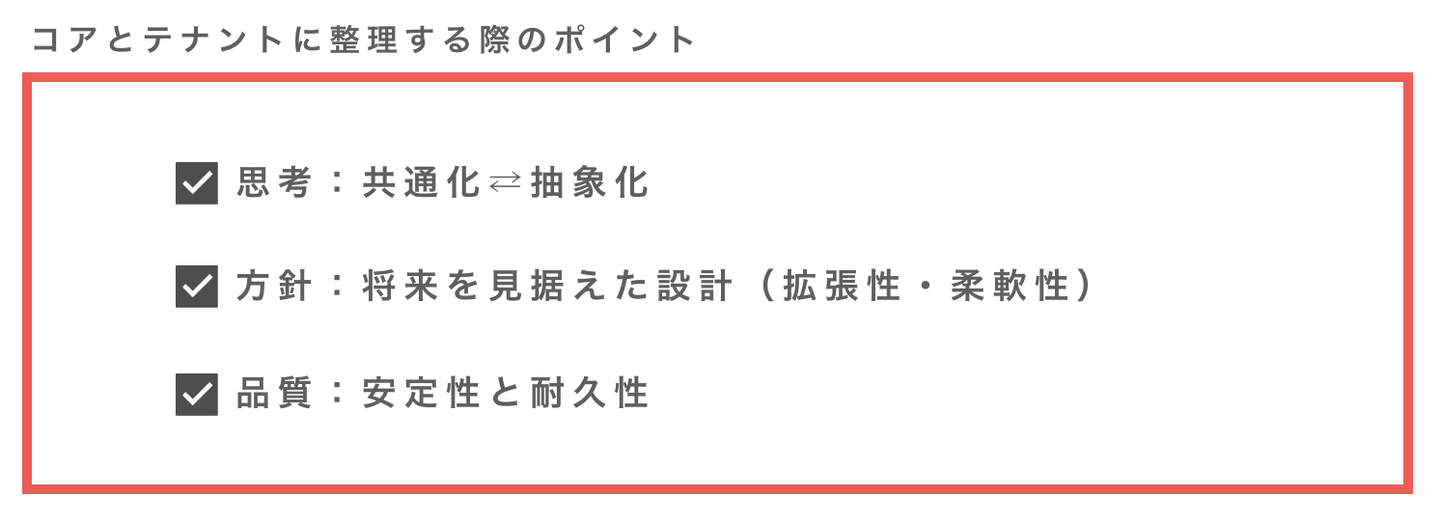 バージョンアップしやすい基盤があるため、コアの機能を作り込みすぎず、デリバリーしてニーズを吸収し、カイゼンを重ねて機能をブラッシュアップしていく。気軽に意見を出し合い、最適なジャッジをしていく。コアとテナント領域の特性を活かしながら、より良いサービスに育てていきたい。