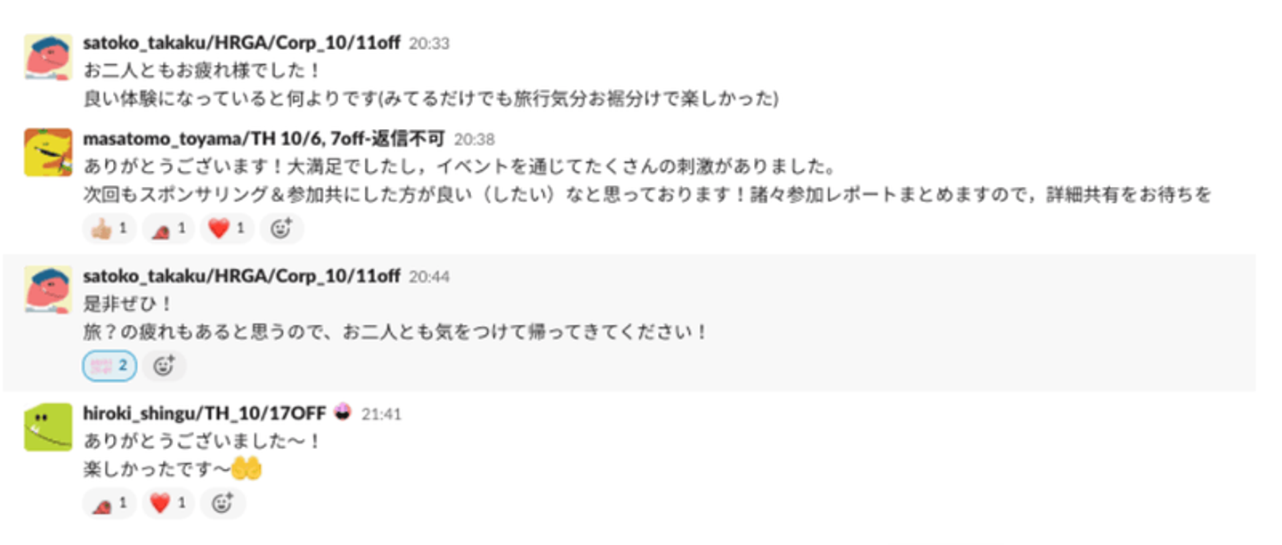Slackチャンネルにはエンジニアや人事メンバーが参加して、発表に関しての気づきや今後挑戦したいと感じたことを Slack でコメントしていきました。