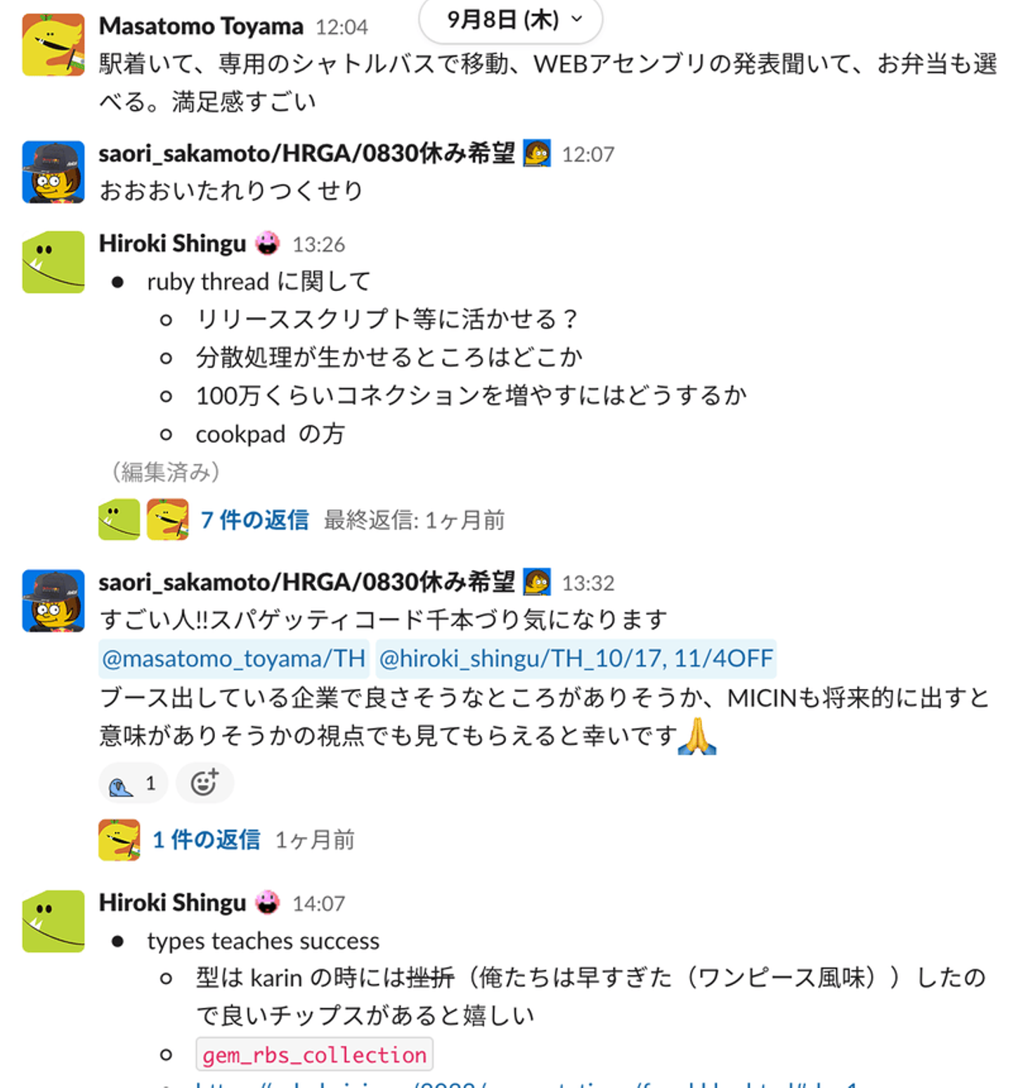 当日はslack上にRubyKaigi専用のLIVEチャンネルを作成し、現場の様子や発表を社内に実況していました。会場が二箇所に分かれていたこともあり、当日は二手に分かれての参加となりました。